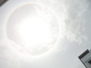 朝、曇り空でなぜか外出。帰りには晴天で急な雨が降り、太陽の周りに虹の輪を発見。